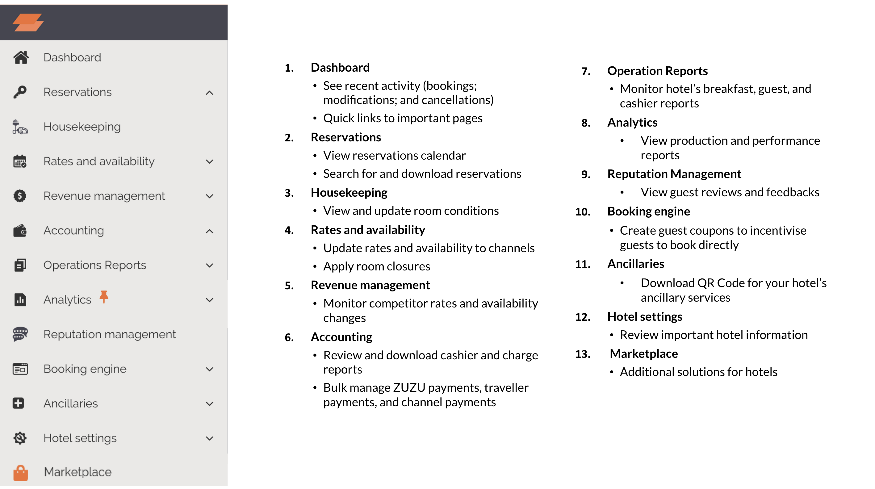 Tags: Navigation menu, dashboard, reservations, housekeeping, rates and availability, revenue management, accounting, reports, booking engine, hotel settings, marketplace