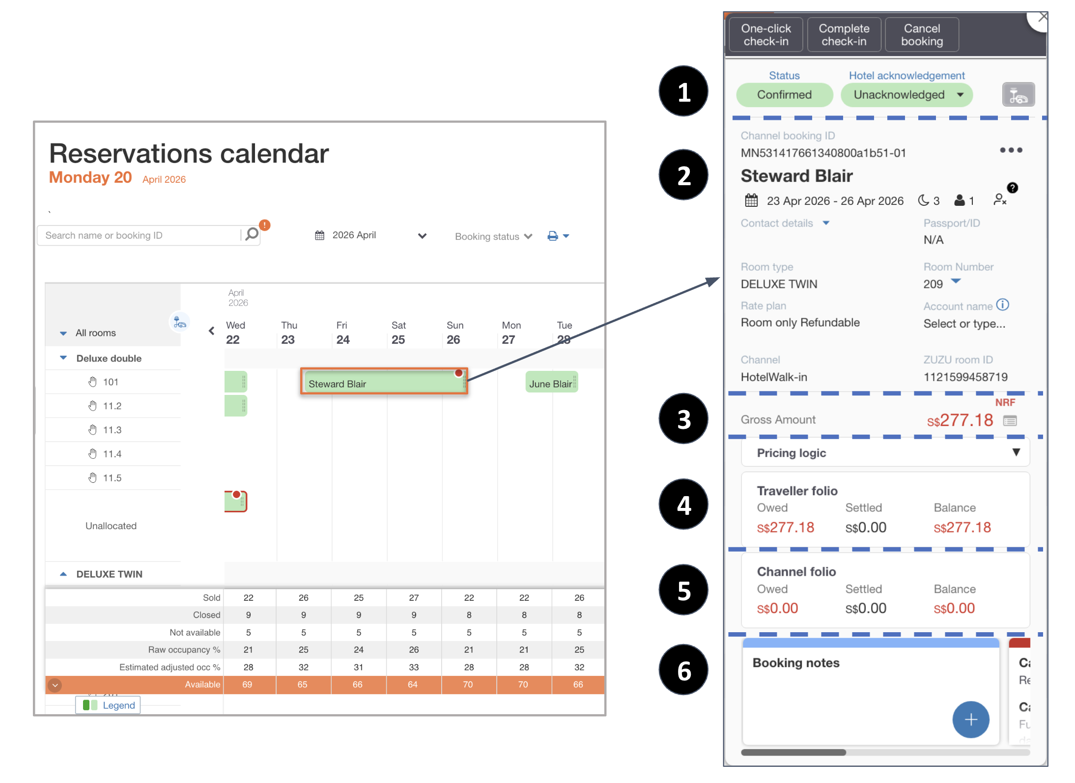 Tags: Booking cards, Reservations calendar, bookings, booking status, acknowledgement status, traveller details, booking details, net amount to hotel, traveller folio, channel folio, booking notes, cancellation policy, modification log, acknowledge booking, check-in, check-out, payments, deposits, channel payments, registration card, customer credit card details, room allocations