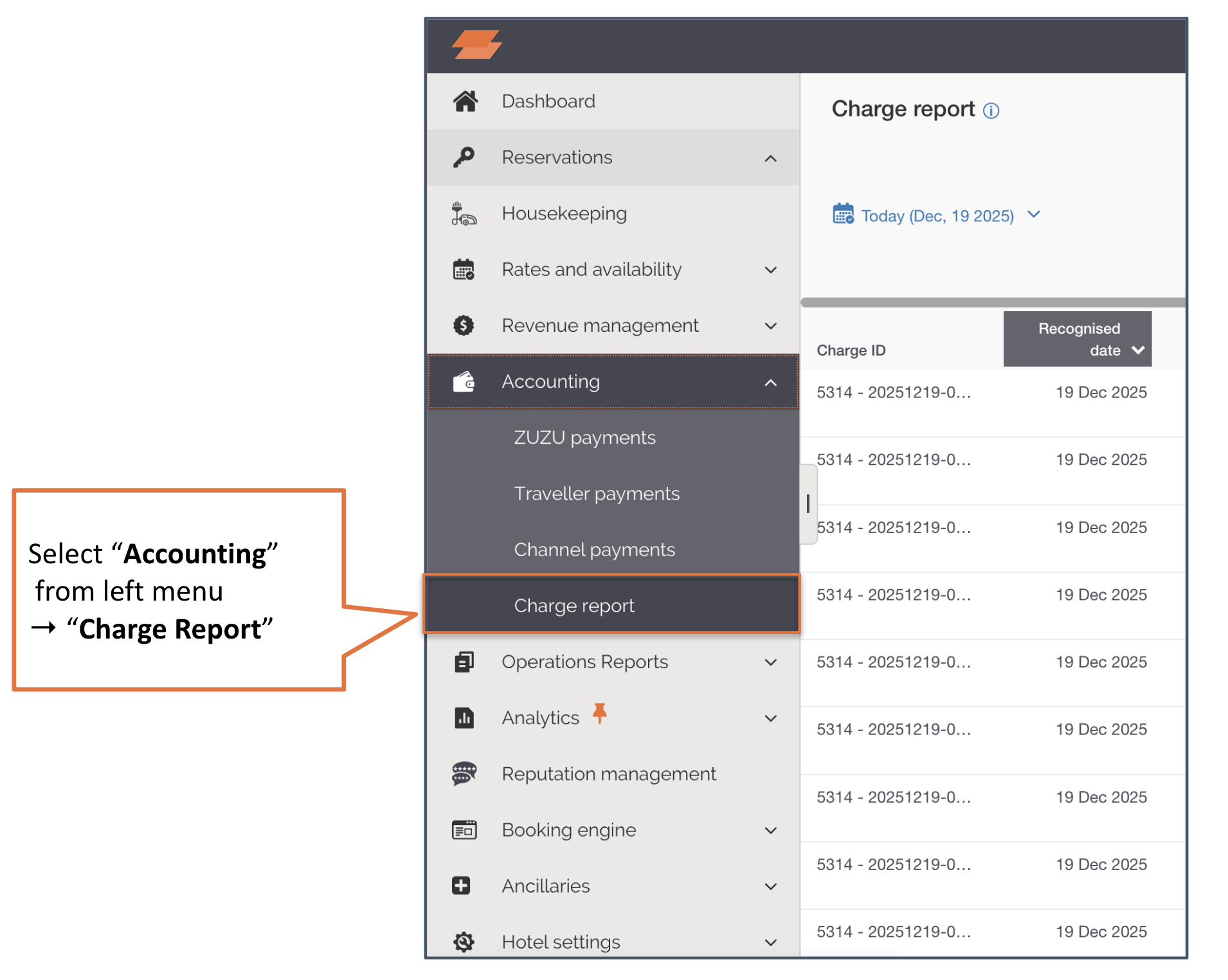 - The charge report is a list of all charges that contribute to revenue for the hotel; this includes: