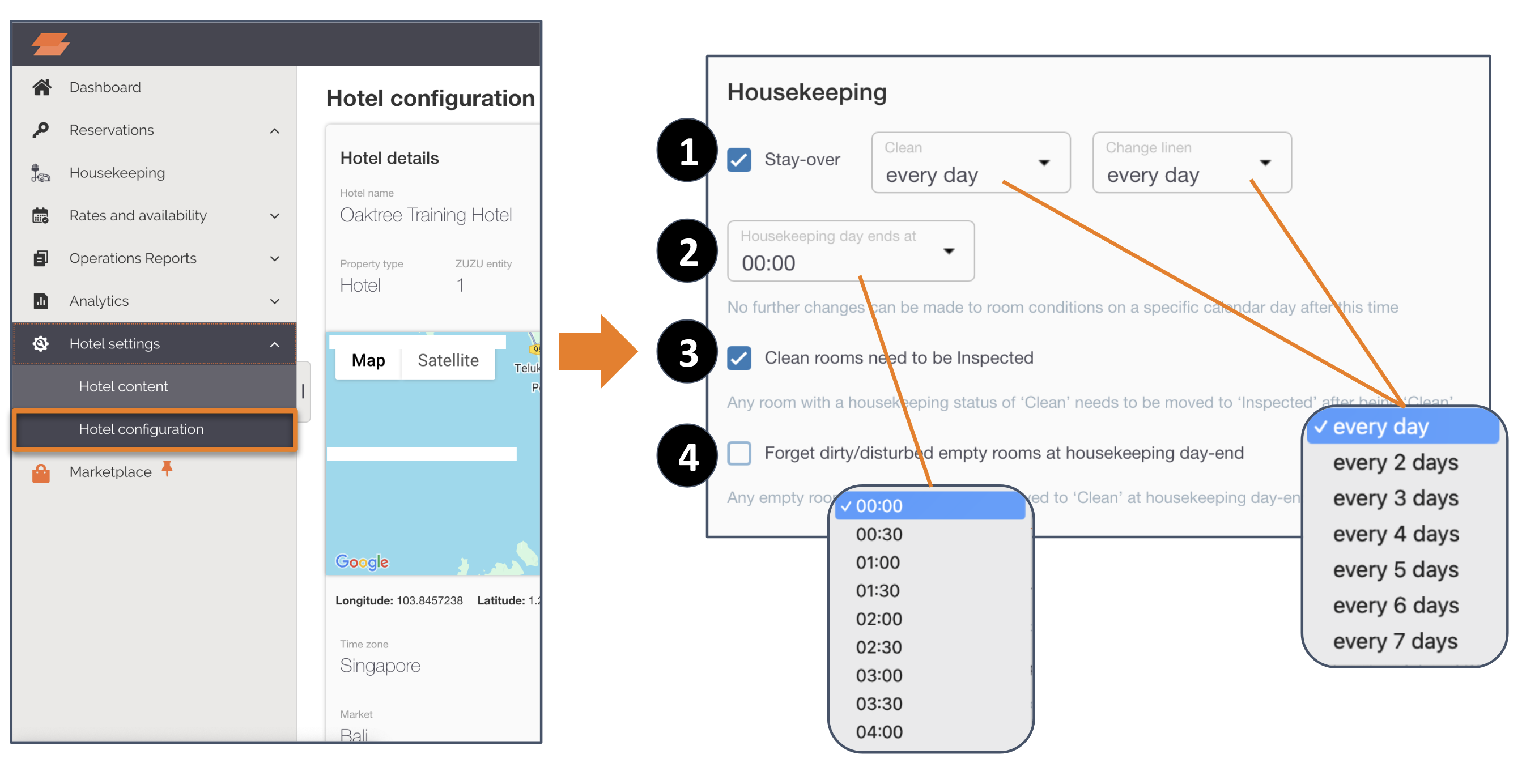 Tags: Housekeeping settings, hotel configuration, cleaning frequency, linen change frequency, end of housekeeping day, room inspection, room conditions