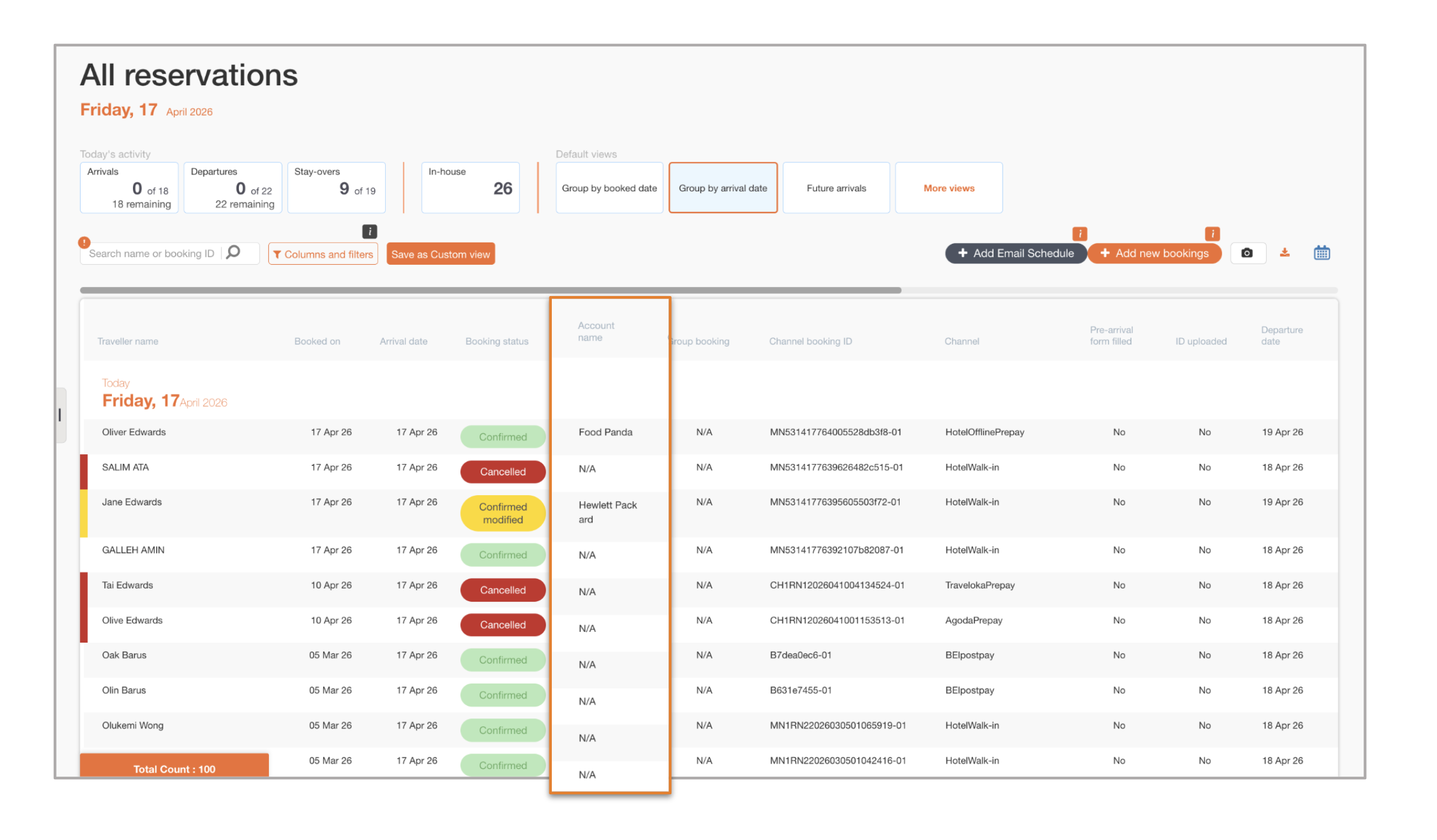 The updated Account Name can also be viewed in the list view on the All Reservations page. To extract all the bookings associated with a particular account, simply use the filter found in the header row and generate a report.