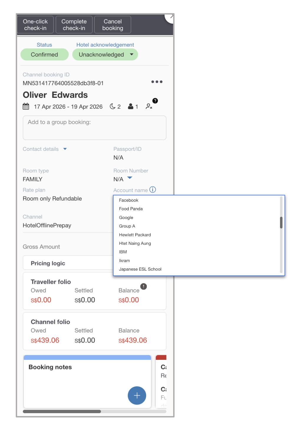 The Account Name field on the booking card allows hotels to update the account or company name associated with the booking. Users can either select an existing account from the drop down list, or create a new account by typing the company’s name into the empty field.