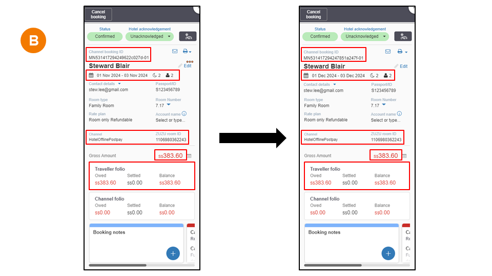 - Booking details: check-in and check-out dates, room count, room type, rate plan.