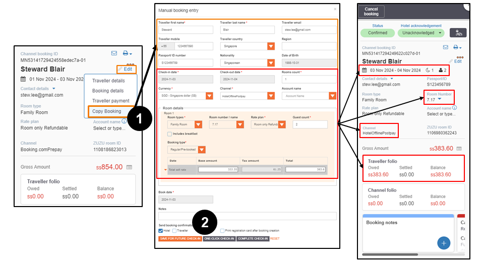 A. Steward booked a family room type for two nights (from 1 Nov to 3 Nov 2024) through Booking.comPrepay. He wants to extend his stay for one more night. Users can use the Copy Booking feature and update the necessary details for the new reservation. In this scenario, update the details as follows: