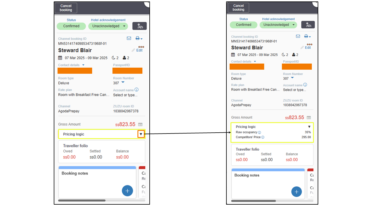The pricing logic feature on the booking card provides insights into the factors influencing room rates at the time of the booking. Specifically, it displays: