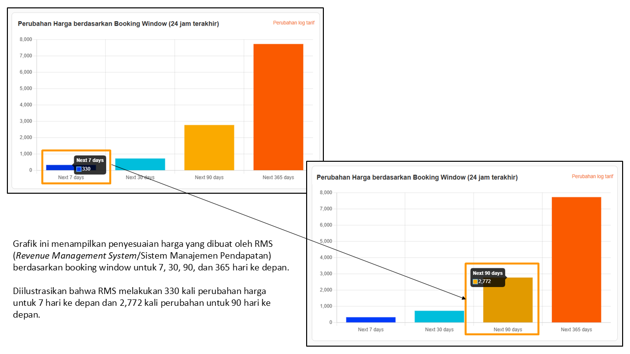 Bagian ini menampilkan jumlah perubahan harga yang dilakukan dalam 24 jam terakhir, yang dikelompokkan berdasarkan booking window – 7, 30, 90, dan 365 hari ke depan. Perubahan ini mencerminkan bagaimana Sistem Manajemen Pendapatan (Revenue Management System/RMS) secara otomatis menyesuaikan harga sebagai respons terhadap perubahan harga kompetitor dan tingkat okupansi – memastikan harga kamar hotel tetap kompetitif dan optimal setiap saat.