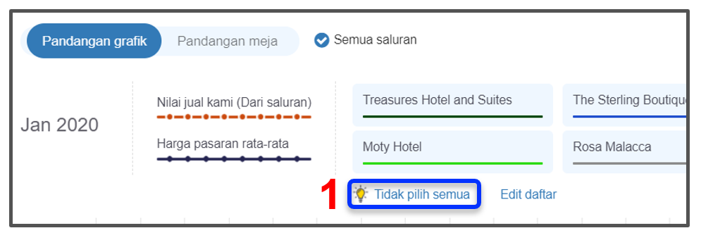 1. Klik pada "Tidak Pilih Semua" untuk batalkan pilihan SEMUA hotel kompetitor yang telah terpilih secara otomatis dalam grafik.