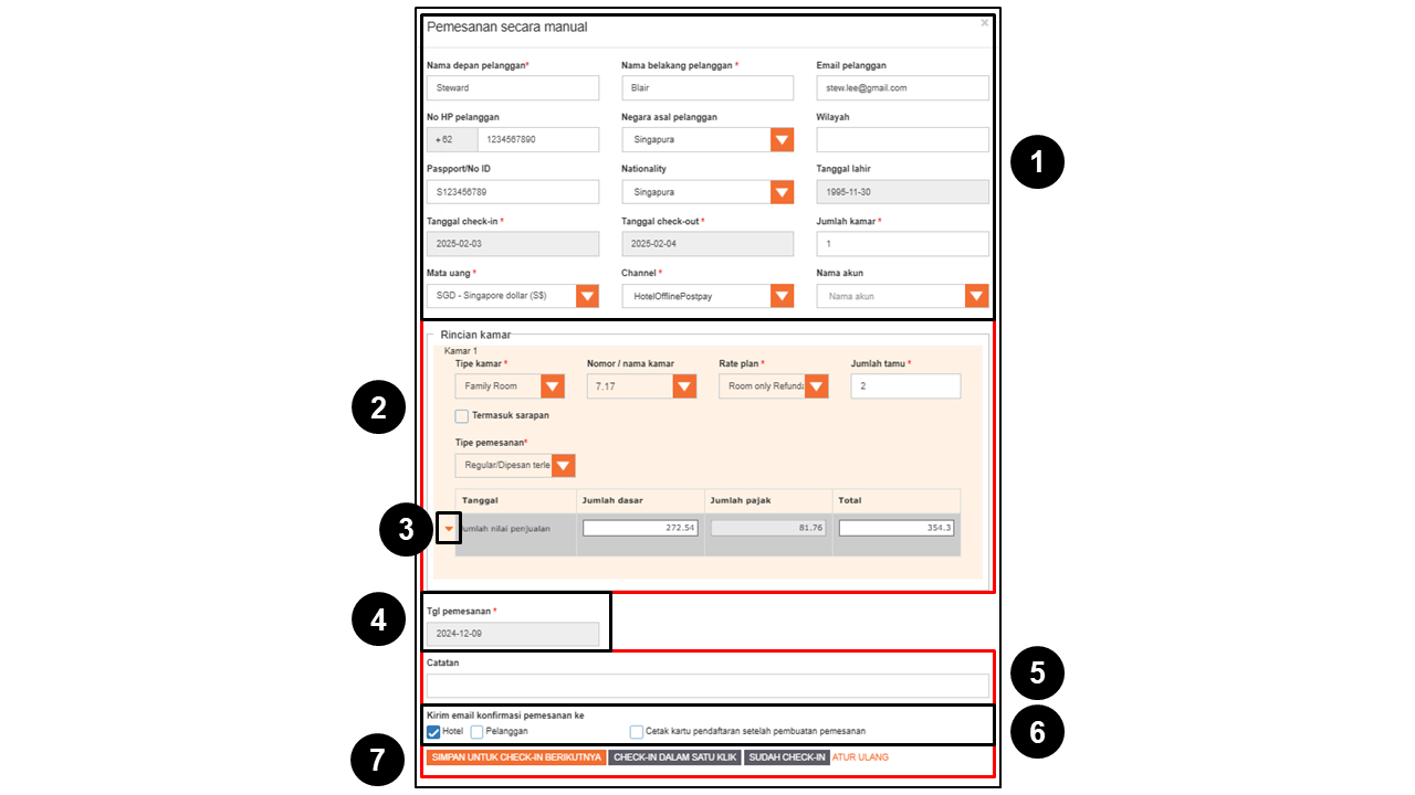 - Detail Tamu Tambahan: Email pelanggan, No. HP pelanggan, Negara asal, Wilayah, Alamat, Kota, Kode Pos, Passport/No. ID, Nama akun, Kewarganegaraan, Tanggal lahir. Rincian Pelanggan dapat diperbarui kapan saja, terlepas dari status pemesanannya.
