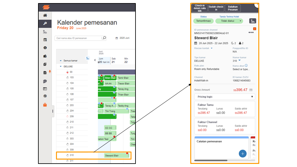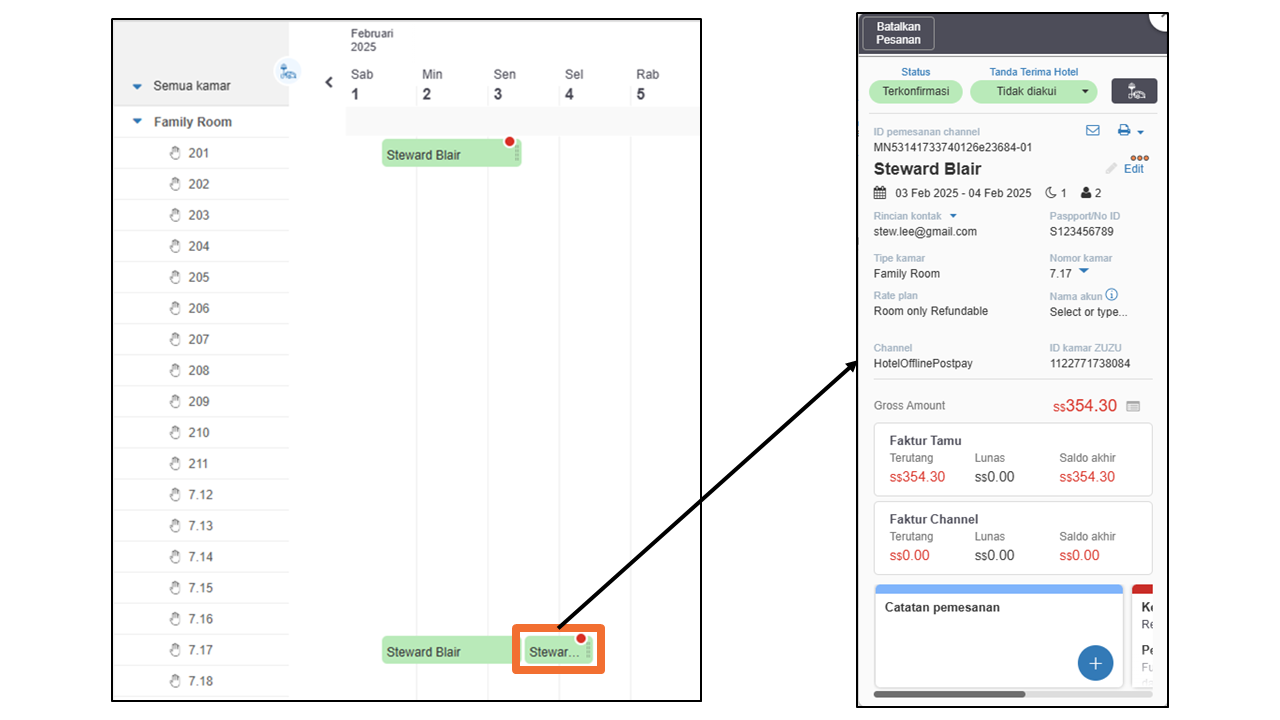 - Detail Pemesanan: Catatan & konfirmasi pemesanan, serta opsi untuk mengirim email konfirmasi pemesanan kepada tamu.