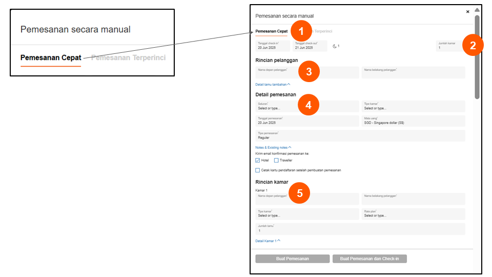 Pemesanan cepat menyediakan cara cepat dan singkat untuk hotel dalam melakukan pemesanan manual, hanya perlu melengkapi beberapa kolom yang harus diisi (ditandai dengan *) untuk menyelesaikan prosesnya.
