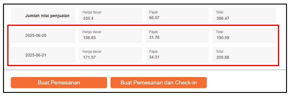 Contoh: Jika tamu melakukan check-in pada 20 Juni dan check-out pada 22 Juni, maka durasi menginapnya adalah dua malam. Bagian Jumlah Nilai Penjualan akan menampilkan rincian untuk setiap malam—20 Juni dan 21 Juni—serta menunjukkan biaya yang dikenakan per malam.