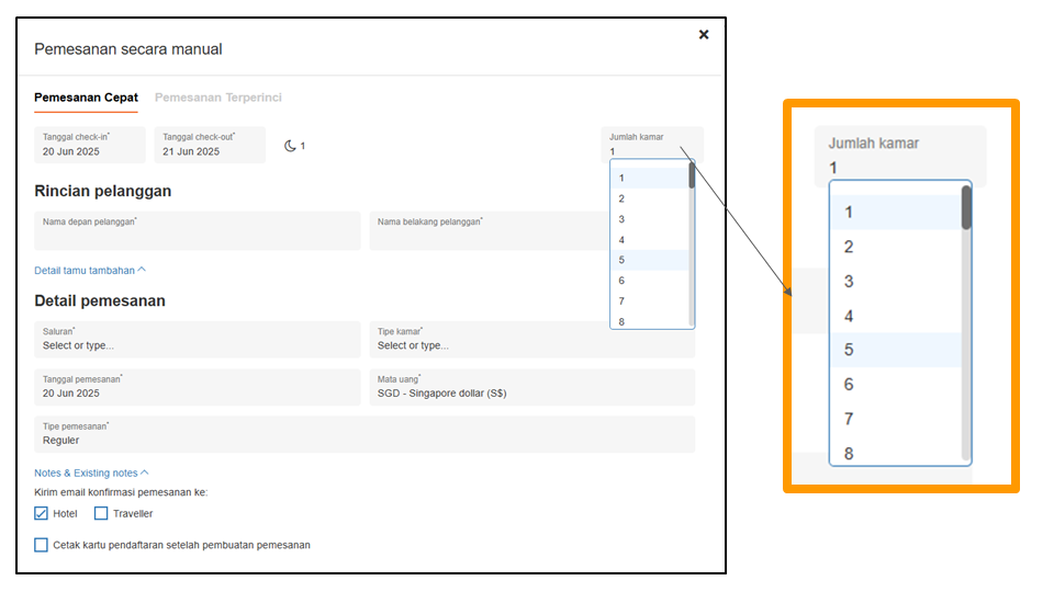 Membuat pemesanan bulk, cocok untuk tamu rombongan perjalanan, proses pembuatannya mirip dengan membuat satu reservasi (baik dari halaman Semua Pemesanan maupun halaman Kalender Pemesanan). Cukup sesuaikan bagian Jumlah kamar untuk menyesuaikan jumlah kamar yang dibutuhkan untuk rombongan perjalanan.