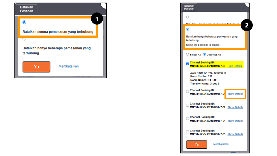 Pemesanan dapat dibatalkan selama tanggal check-innya belum berlalu dan status pemesanan masih dalam status "Terkonfirmasi". Untuk membatalkan pemesanan bulk, pengguna dapat memilih dari dua opsi berikut:
