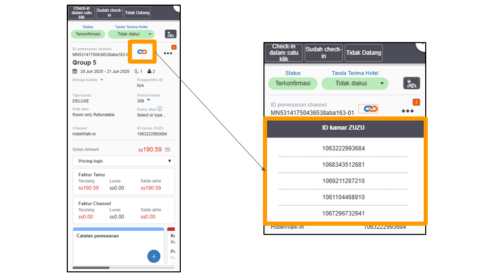 Reservasi dengan banyak kamar sekaligus yang sudah terkonfirmasi dapat dikenali dengan ikon rantai yang ada di kartu pemesanan. Mengeklik pada ikon tersebut akan menampilkan ID Kamar ZUZU lainnya yang terdaftar di reservasi yang sama. Mengeklik pada ID Kamar ZUZU mengarahkan pengguna untuk membuka kartu pemesanan kamar tersebut.