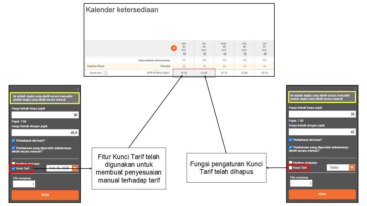 Dengan mengunci tarif, artinya hotel mencegah RMS untuk menyesuaikan harga secara dinamis berdasarkan permintaan dan kondisi pasar, yang berpotensi menyebabkan hilangnya peluang pendapatan. - Kontrol Manual Sementara