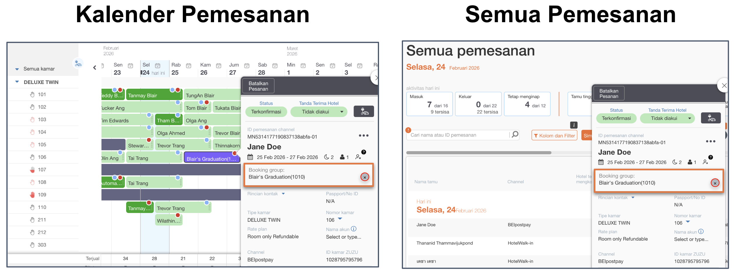 - Reservasi tersebut akan teridentifikasi sebagai pemesanan grup di halaman Kalender Pemesanan maupun Semua pemesanan.