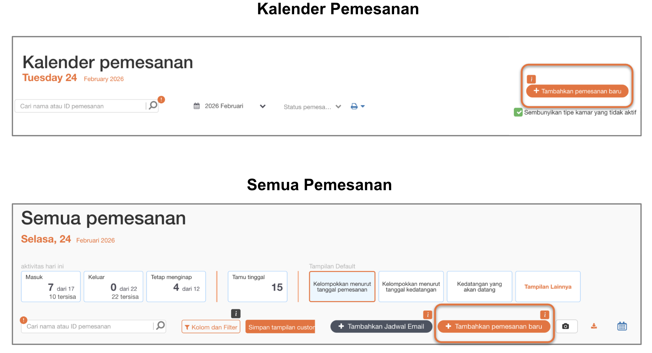 1. Dari Kalender Pemesanan dan Semua Pemesanan: Pada kedua halaman tersebut, pengguna dapat mengklik “Tambahkan Pemesanan Baru” di bagian pojok atas.