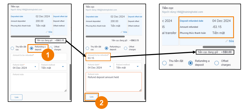 - Nhập số tiền cần hoàn dựa trên số tiền đặt cọc giữ lại (deposit amount held), chọn phương thức hoàn tiền, và thêm ghi chú hoàn tiền (tùy chọn). Nhấp Lưu để ghi nhận việc hoàn tiền đặt cọc.