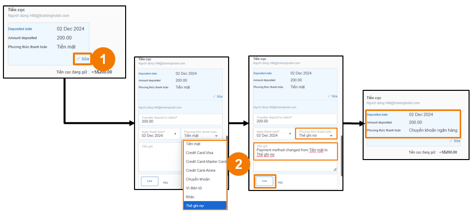 - Chỉ có phương thức thanh toán và ghi chú đặt cọc là có thể thay đổi. Sử dụng menu thả xuống để chọn phương thức thanh toán khác, và điền ghi chú đặt cọc nếu cần. Nhấn Lưu để cập nhật thay đổi.