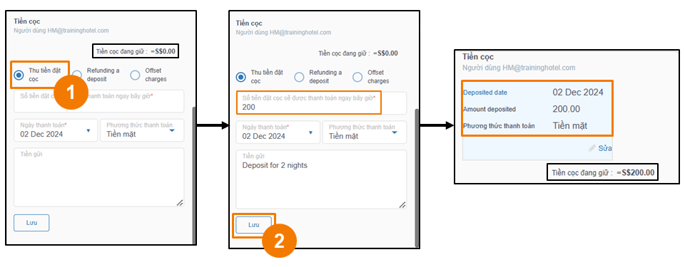 Nhân viên lễ tân đã thu đặt cọc bằng tiền mặt 200.00 từ khách lưu trú tại khách sạn trong hai ngày. Số tiền cọc đang giữ đã được cập nhật từ 0.00 thành 200.00.